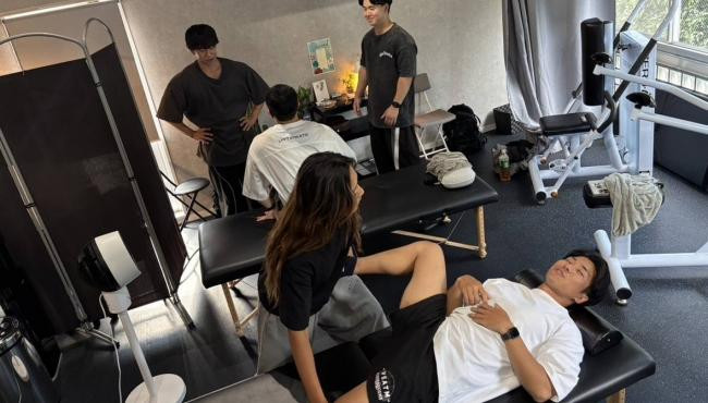 研修風景です。トレーニングやストレッチの技術をみんなで高めあいます。